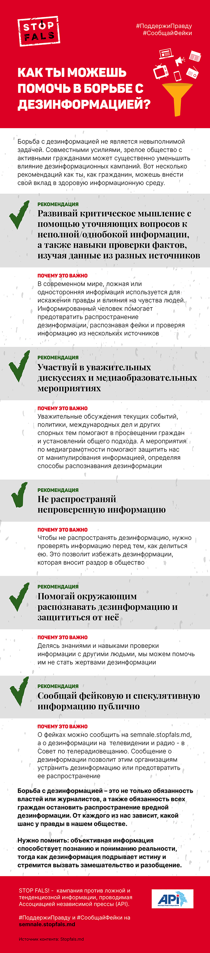 STOP FALS! – кампания против ложной и тенденциозной информации, проводимая Ассоциацией независимой прессы (API), представляет в инфографике некоторые полезные для этого рекомендации. #НетДезинформации #СообщаемФейки