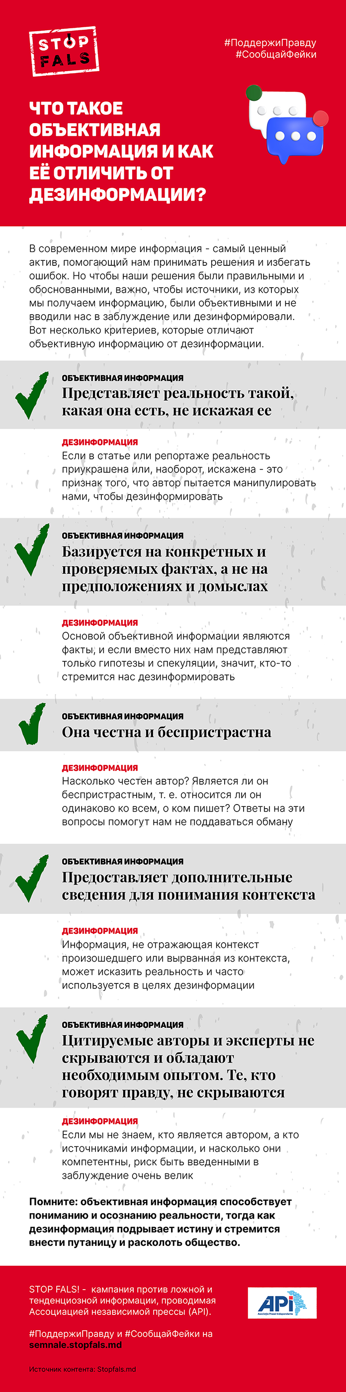 STOP FALS! – кампания против ложной и тенденциозной информации, проводимая Ассоциацией независимой прессы (API), описывает в следующей инфографике разницу между объективной информацией и дезинформацией. #НетДезинформации #СообщайФейки