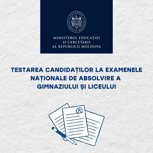 Ministerul Educației și Cercetării și Agenția Națională pentru Curriculum și Evaluare (ANCE) desfășoară, în perioada 23 martie – 03 aprilie 2026, testarea candidaților la examenele naționale de absolvire de gimnaziu și liceu. Testarea are scopul de a determina gradul de pregătire a elevilor pentru examene. Elevii claselor a IX-a și a XII-a vor avea posibilitatea să rezolve teste similare cu modelele prevăzute de actele normative în vigoare.