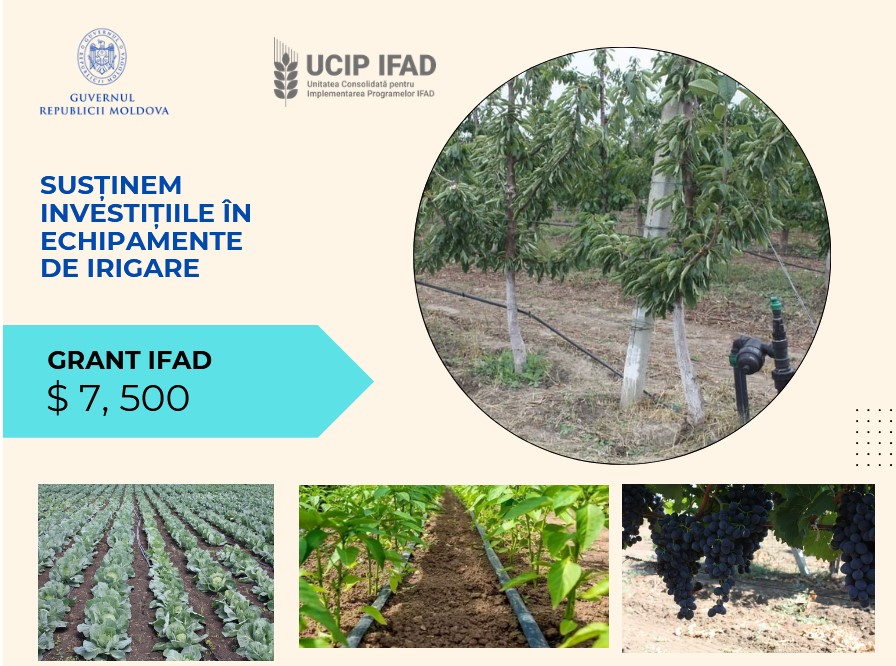 În cadrul programelor implementate de Ministerul Agriculturii și Industriei Alimentare, prin UCIP IFAD Moldova, cu sprijinul Fondului Internațional pentru Dezvoltarea Agricolă, 26 de fermieri din Republica Moldova vor beneficia de granturi pentru procurarea echipamentelor de irigare.