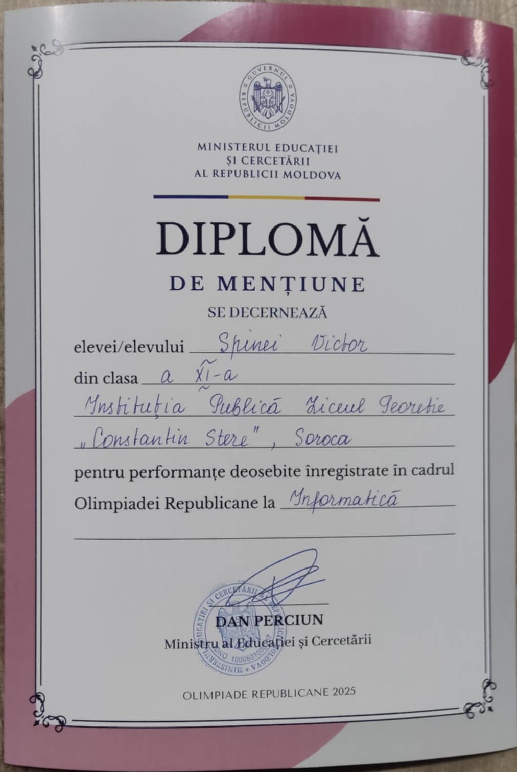 Printre cei premiați este și elevul clasei a XI-a de la Liceul Teoretic „Constantin Stere” din Soroca, Victor Spinei, care a primit o Diplomă de mențiune.
