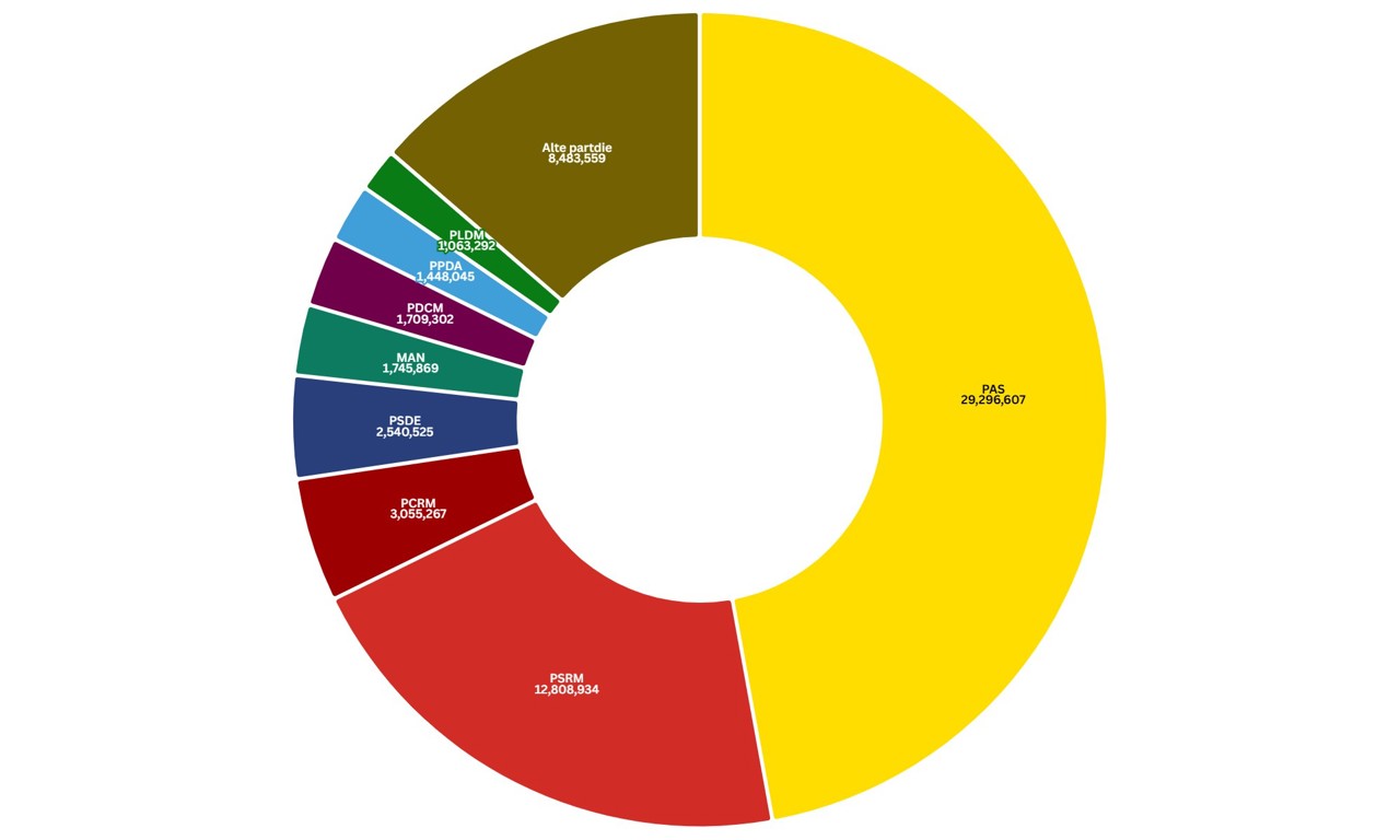Cele mai mari sume vor ajunge la partidele care au acumulat cel mai mare număr de voturi la ultimele scrutine. Partidul Acțiune și Solidaritate (PAS) este formațiunea care va primi cea mai mare sumă, de aproximativ 29,3 milioane de lei, urmat de Partidul Socialiștilor din Republica Moldova (PSRM), care va încasa peste 12,8 milioane de lei.