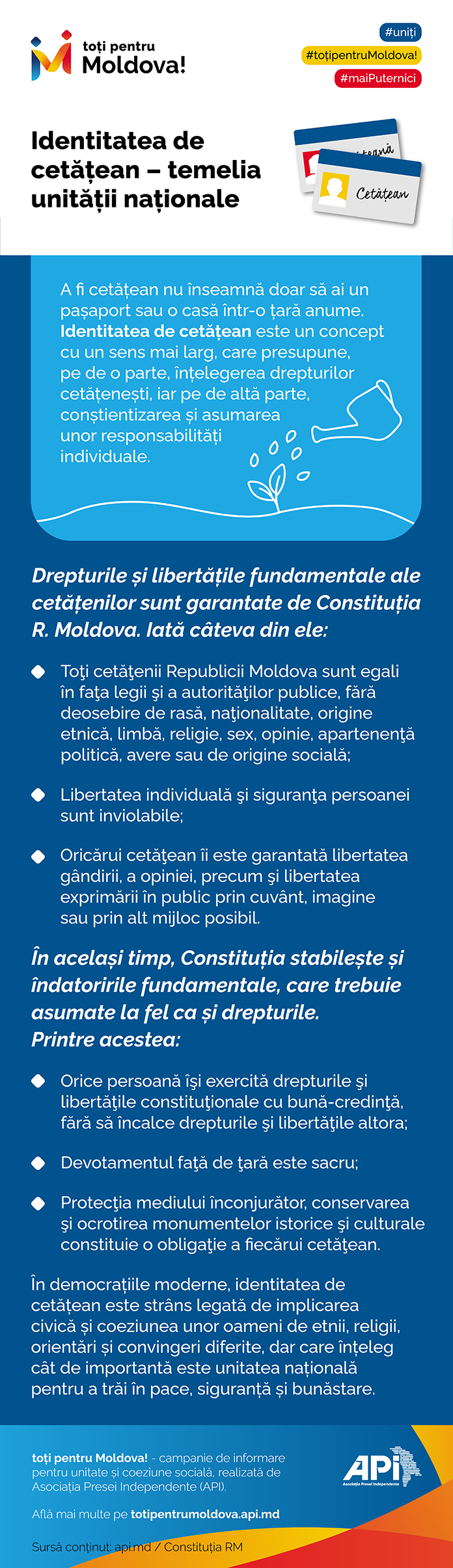 Acest infografic este parte a Campaniei de informare pentru unitate și coeziune socială „toți pentru Moldova!”, realizată de Asociația Presei Independente (API). Scopul nostru este să contribuim la consolidarea unității și a securității naționale. Te invităm să fii alături de noi.