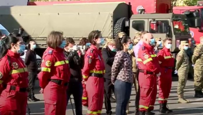 Pentru buna desfăşurare a activităţilor, Ministerul Apărării Naţionale contribuie cu 10 sisteme de izolare şi transport al personalului contaminat cu agenţi biologici, echipamente care vor fi donate, la finalul misiunii, Republicii Moldova… Premierul României, Ludovic Orban, ministrul Apărării Naţionale, Nicolae-Ionel Ciucă, ministrul Afacerilor Externe, Bogdan Aurescu, şi şeful Departamentului pentru Situaţii de Urgenţă, dr. Raed Arafat, au petrecut echipa medicală de la Iași. (INFO OdN, Foto: Digi24)
