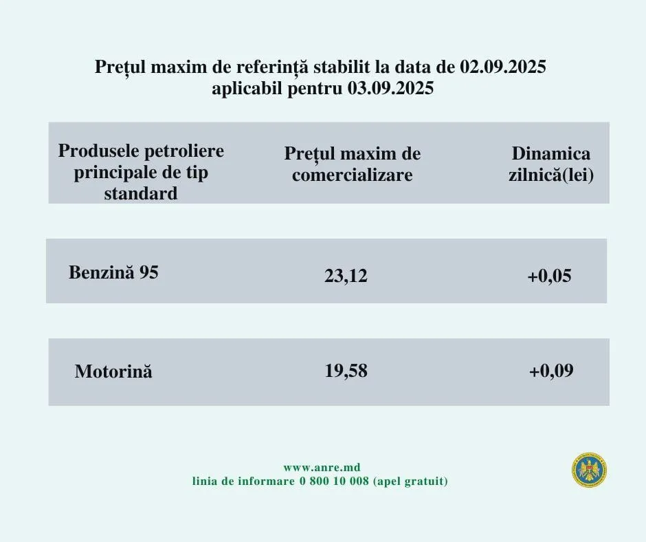Agenția Națională pentru Reglementare în Energetică anunță noile prețuri la carburanți pentru ziua de miercuri, 3 septembrie 2025 – benzina se va scumpi cu 5 bani, iar motorina cu 9 bani.
