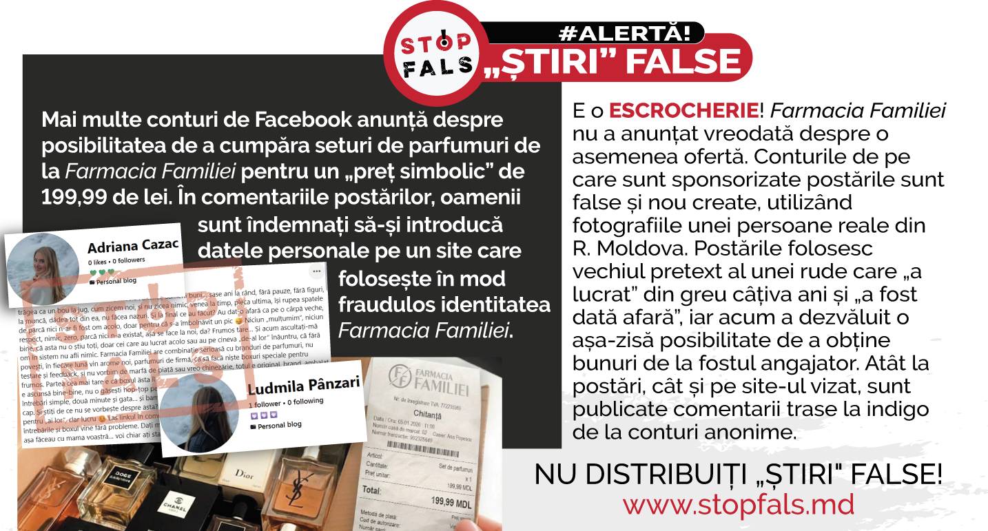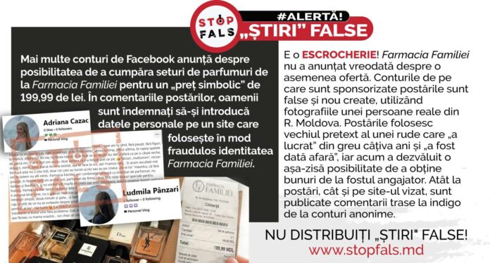 Mai multe conturi de Facebook anunță despre posibilitatea de a cumpăra seturi de parfumuri de la Farmacia Familiei pentru un „preț simbolic” de 199,99 de lei. În comentariile postărilor, oamenii sunt îndemnați să-și introducă datele personale pe un site care folosește în mod fraudulos identitatea Farmacia Familiei.