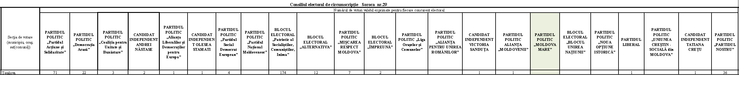 Conform datelor oficiale prezentate de Consiliul Electoral de Circumscripție Soroca nr. 29, rezultatele se prezintă astfel: