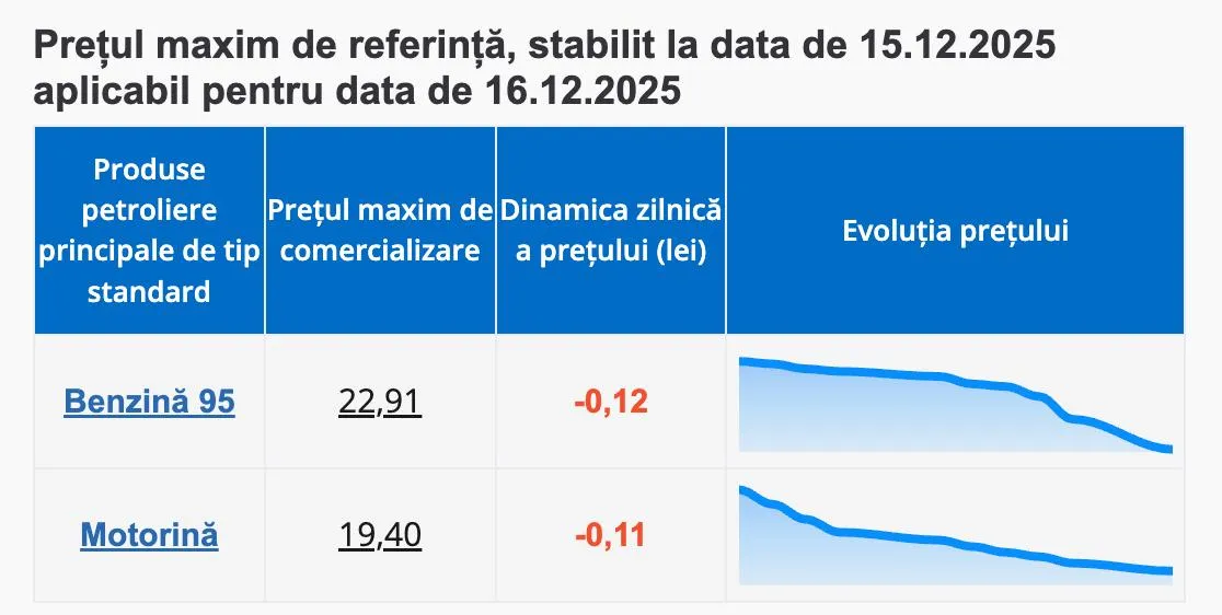 Agenția Națională pentru Reglementare în Energetică a stabilit prețurile maxime de referință pentru produsele petroliere principale de tip standard pentru astăzi, 16 decembrie – prețul unui litru de benzină A95 nu trebuie să depășească 22,91 lei, iar cel pentru un litru de motorină – 19,40 lei.