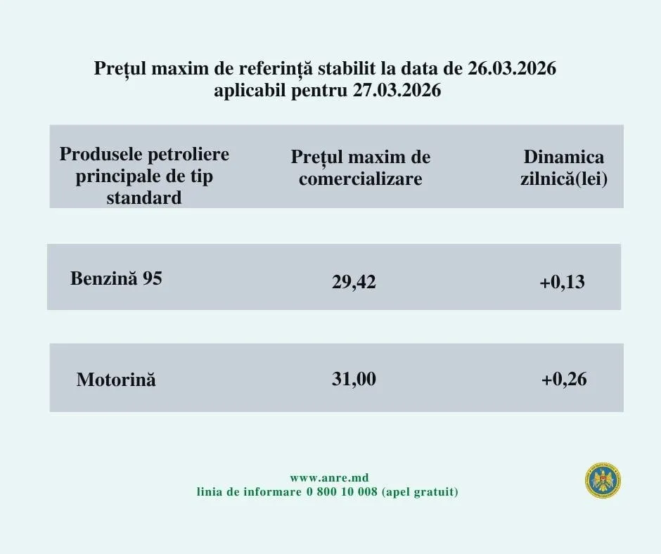 Astfel, prețul maxim pentru benzină A95 este de 29,42 lei pentru un litru, în creștere cu 13 bani față de ziua precedentă, iar motorina standard costă 31,00 lei pentru un litru, după o majorare de 26 de bani.