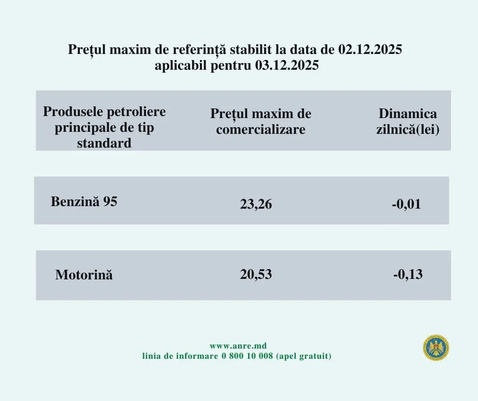 Agenția Națională pentru Reglementare în Energetică a anunțat noile prețuri pentru ziua de astăzi, 3 decembrie 2025 – benzina se va ieftini cu 1 ban, iar motorina cu 13 bani.