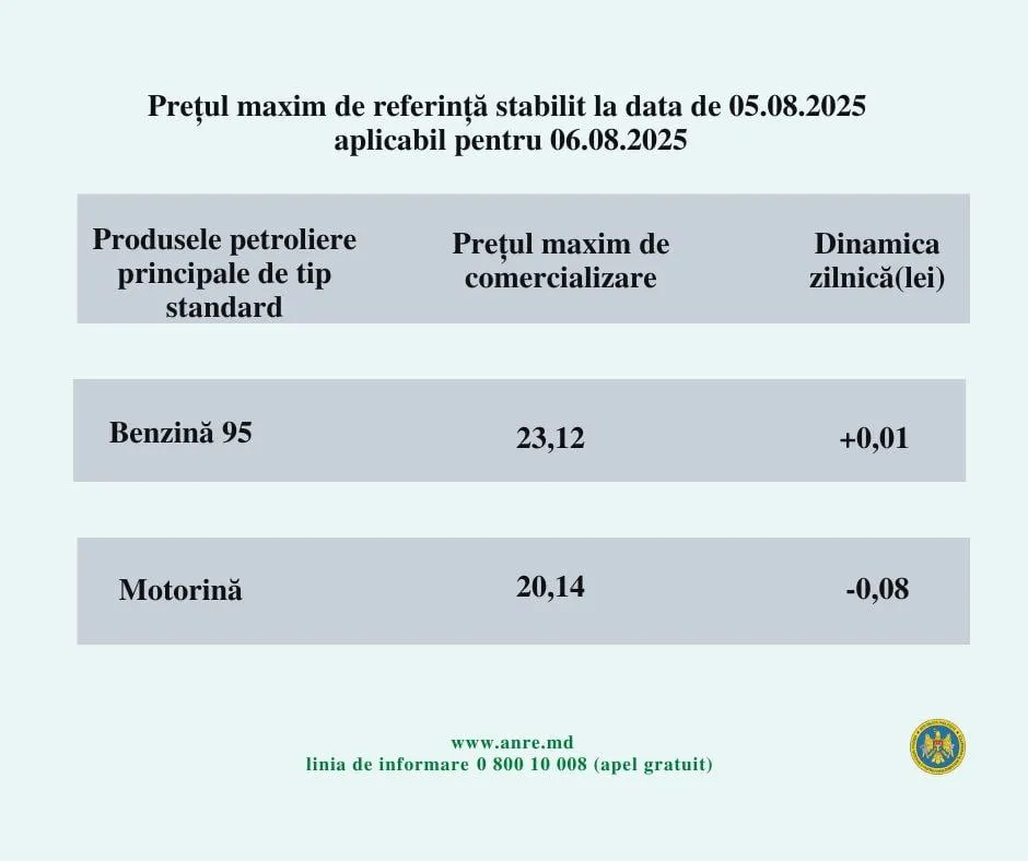 Agenția Națională pentru Reglementare în Energetică anunță că astăzi, 6 august 2025, benzina se va scumpi cu 1 ban, iar motorina se va ieftini cu 8 bani.