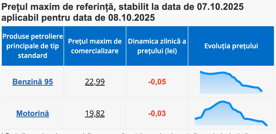 Pentru ziua de astăzi, 8 octombrie 2025, Agenția Națională pentru Reglementare în Energetică a stabilit că prețul unui litru de benzină A95 nu trebuie să depășească 22,99 lei, iar cel pentru un litru de motorină – 19,82 lei.