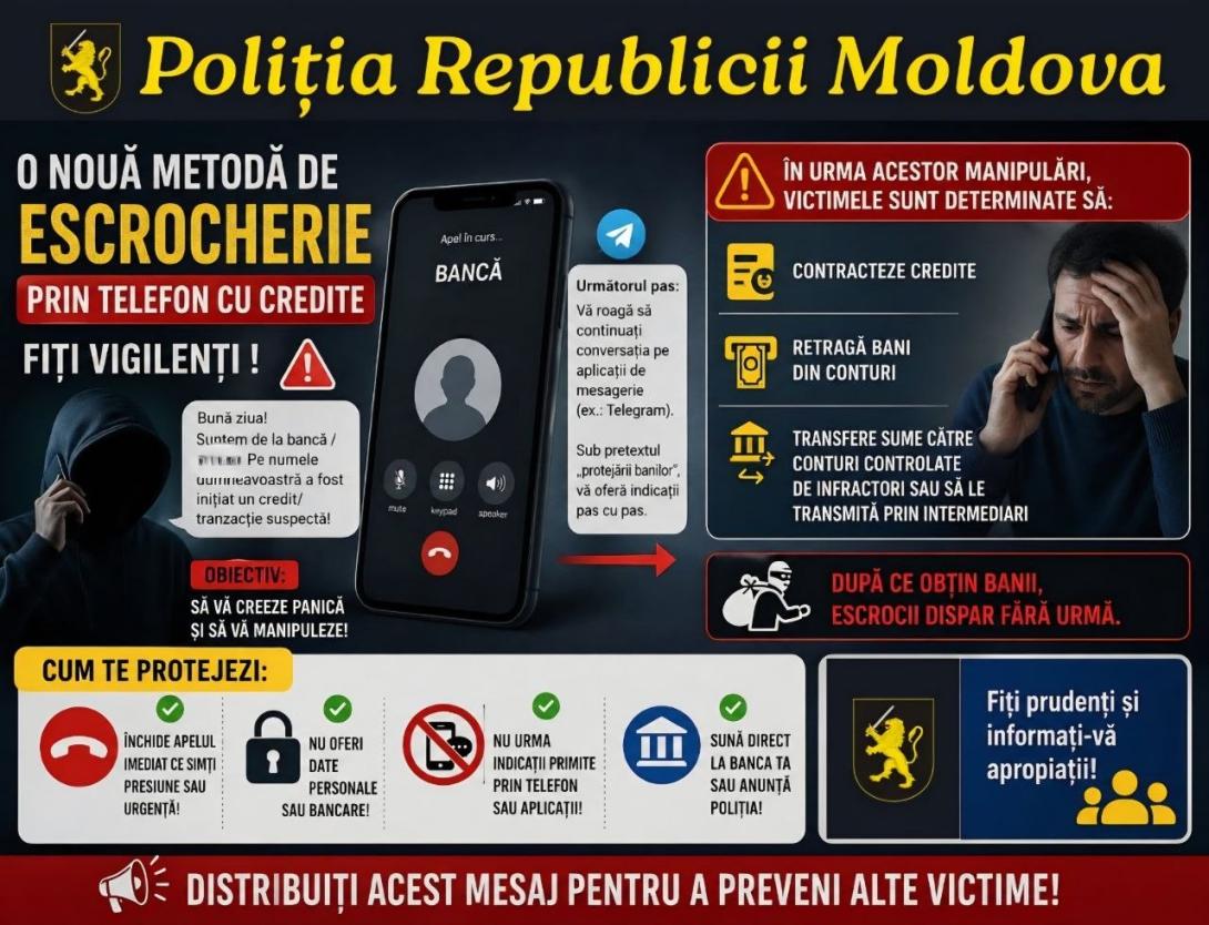 Poliția atenționează cetățenii despre apariția unei noi metode de înșelăciune, prin care persoane necunoscute contactează telefonic potențiale victime, pretinzând că sunt reprezentanți ai instituțiilor bancare sau ai organelor de drept.