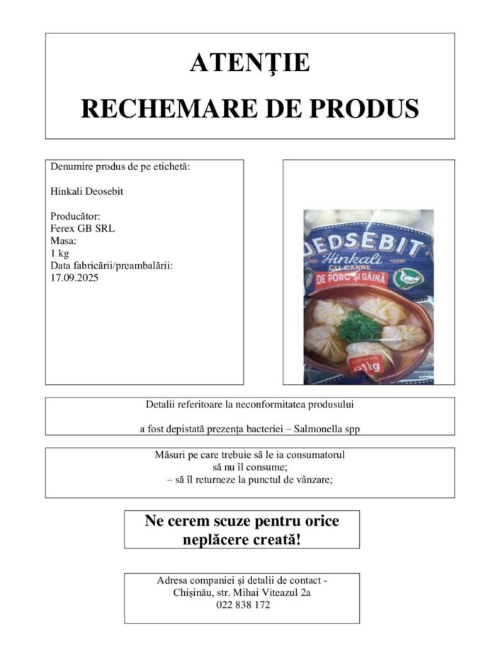 Agenția Națională pentru Siguranța Alimentelor vă informează că operatorul din domeniul alimentar Ferex GB SRL: recheamă de la consumatori următorul produs. Detalii referitoare la neconformitatea produsului a fost depistată prezența bacteriei Salmonella spp.