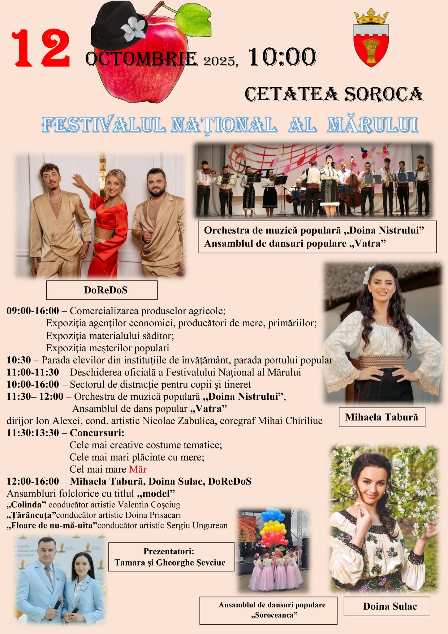 Programul artistic include evoluții deosebite ale Orchestrei de muzică populară „Doina Nistrului”, ansamblurilor de dansuri „Vatra” și „Soroceanca”, precum și recitaluri susținute de îndrăgiții interpreți Mihaela Tabură, Doina Sulac și trupa DoReDoS. Concursurile tematice, cum ar fi „Cele mai creative costume”, „Cele mai mari plăcinte cu mere” și „Cel mai mare măr”, vor adăuga o notă de originalitate sărbătorii. Evenimentul va fi prezentat de Tamara și Gheorghe Șevciuc, iar intrarea este liberă.