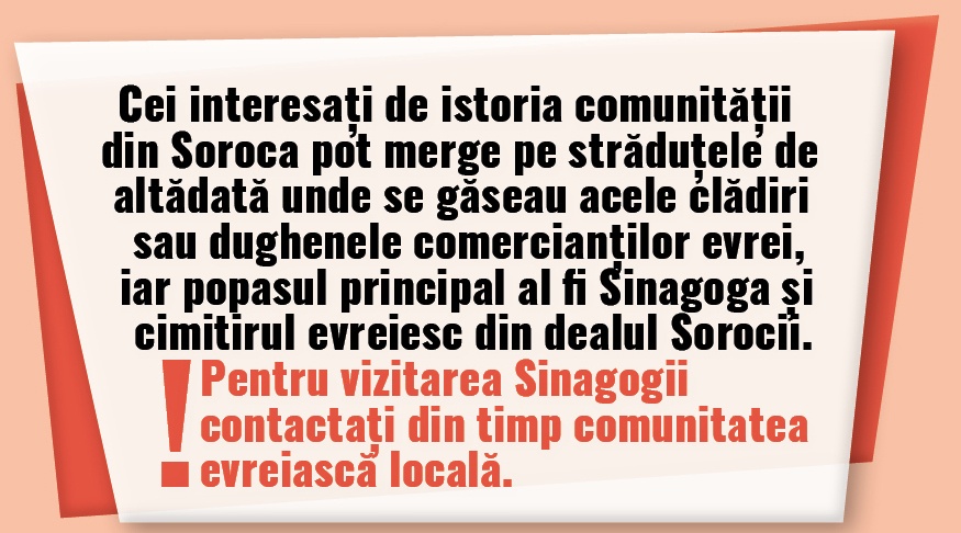 Cei interesați de istoria comunității din Soroca pot merge pe străduțele de altădată unde se găseau acele clădiri sau dughenele comercianților evrei, iar popasul principal al fi Sinagoga și cimitirul evreiesc din dealul Sorocii. Ce-i drept, în Sinagoga din centrul orașului, care în perioada sovietică găzduia antrenamentele sportivilor locali, rar pot fi oficiate servicii divine pe motiv că, după tradițiile evreiești, trebuie să fie prezent cel puțin minianul, adică minim 10 oameni, altfel este interzis să se facă rugăciunile.