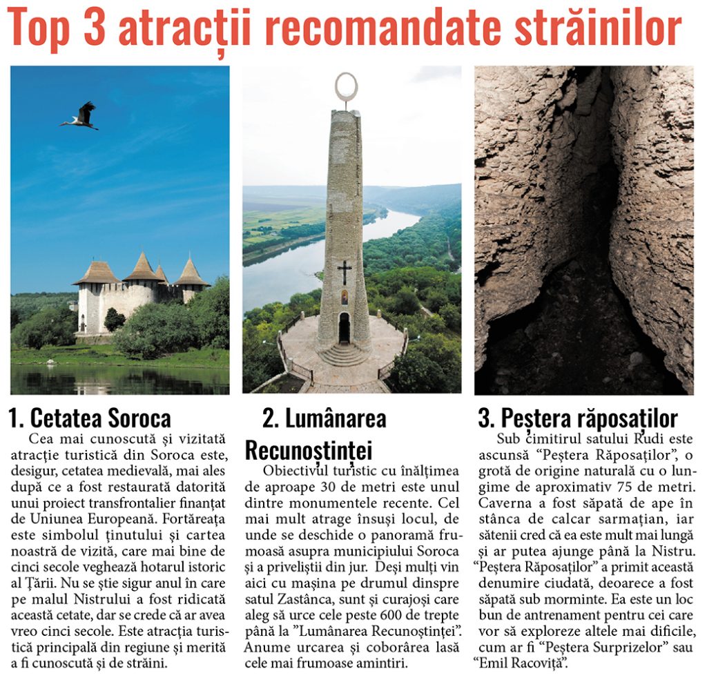 Ținutul Sorocii este apreciat pentru atracțiile turistice de aici, atât pentru cele foarte populare, cât și pentru cele cunoscute și vizitate de mai puțini turiști. Și fiindcă pandemia le-a stricat multora planurile de vacanță, noi vă propunem să le adaptați situației și să beneficiați de călătorii acasă, prin frumoasele locuri din preajma noastră. Redacția “Observatorul de Nord” vine cu câteva rute turistice adaptate pentru diferite categorii: familii cu copii, gașcă de tineri, turiști seniori, pelerini, excursii pentru copii, străini care ne vizitează și excursii pietonale. Dar pentru ca să le prezentăm oaspeților noștri ce avem mai frumos, bine ar fi să le cunoaștem mai întâi noi…