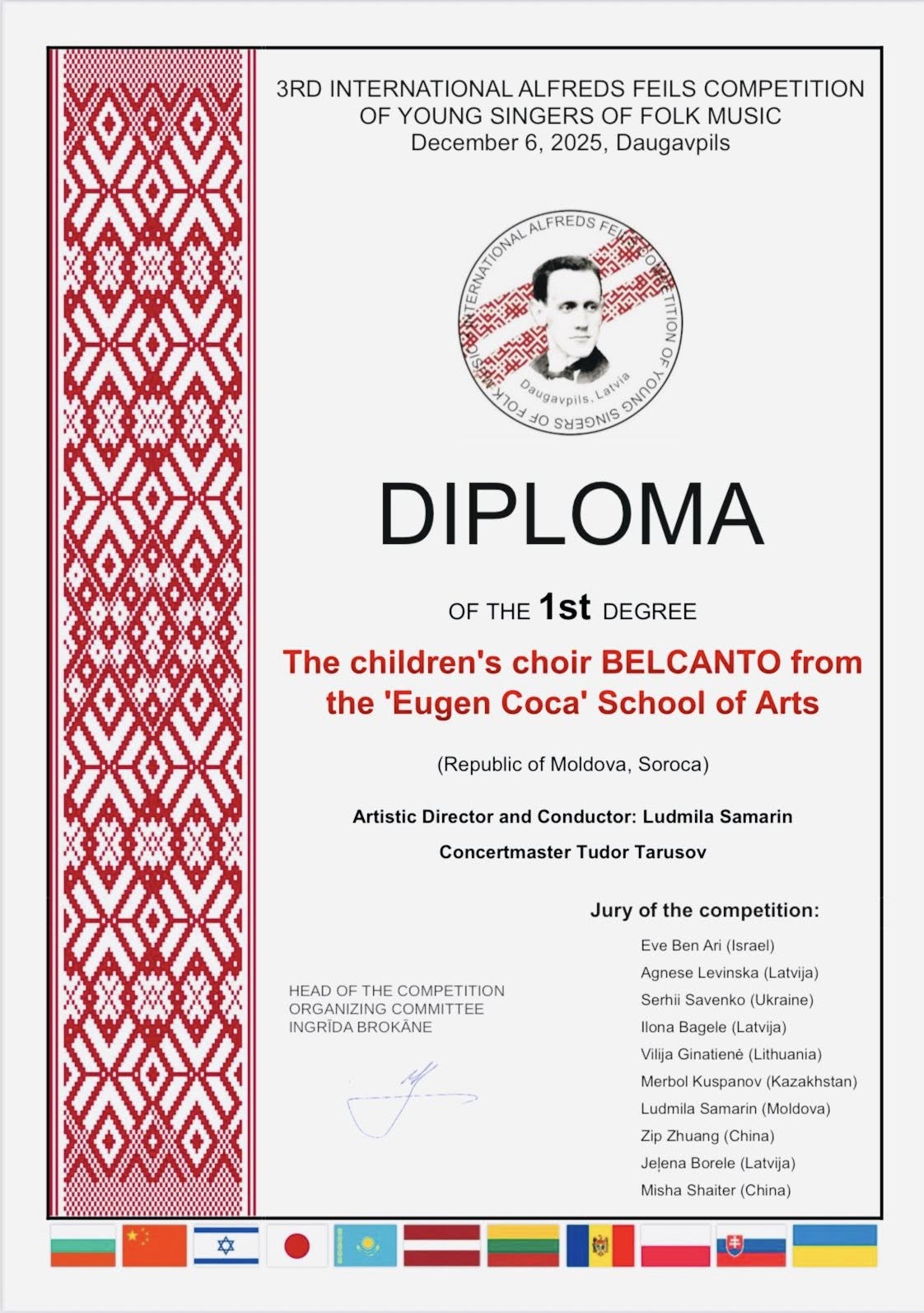 Corul BELCANTO, de la Școala de Arte „Eugeniu Coca” din Soroca (dirijor Ludmila SAMARIN, maestru de concert Tudor TARUSOV) a obținut un nou succes remarcabil – PREMIUL I la Concursul Internațional „Alfrēds Feil”!
