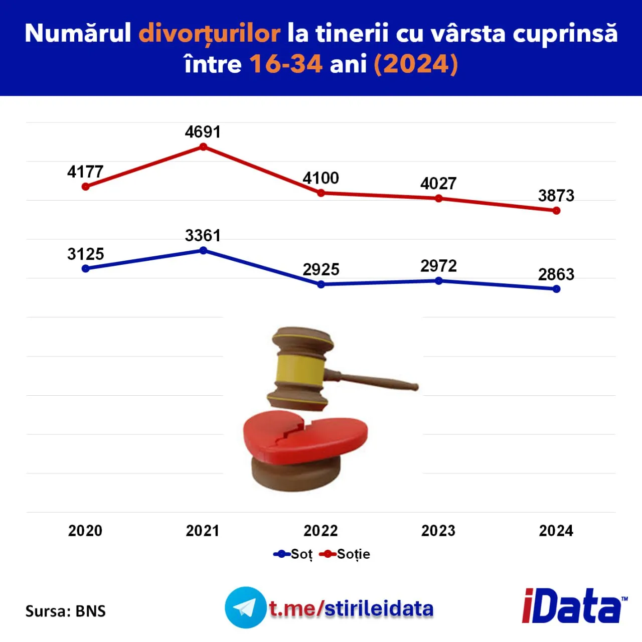 Și numărul divorțurilor în rândul tinerilor a scăzut treptat, după un maxim atins în 2021, când peste 4.600 de soții și 3.300 de soți au trecut printr-o separare legală. În 2024, cifrele au ajuns la 3.900 de femei și 2.800 de bărbați, cel mai scăzut nivel din ultimii cinci ani.