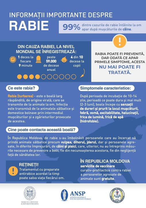Agenția Națională pentru Sănătate Publică informează că, în prezent, se înregistrează o tendință nefavorabilă a situației epizootice la rabie și recomandă autorităților responsabile consolidarea acțiunilor intersectoriale pentru a preveni și limita răspândirea virusului. Prezența animalelor fără stăpân în localități constituie un factor de dezechilibru epidemiologic și epizootic, favorizând circulația virusului rabic în mediul comunitar și creșterea riscului de apariţie a cazurilor de rabie umană. Această situație necesită vigilență din partea populației și întreprinderea unor măsuri urgente de către serviciile specializate – autoritățile publice locale și serviciile sanitar-veterinare din teritorii, pentru gestionarea problemei câinilor fără stăpân și prevenirea cazurilor de rabie la animale, informează ansp.md.