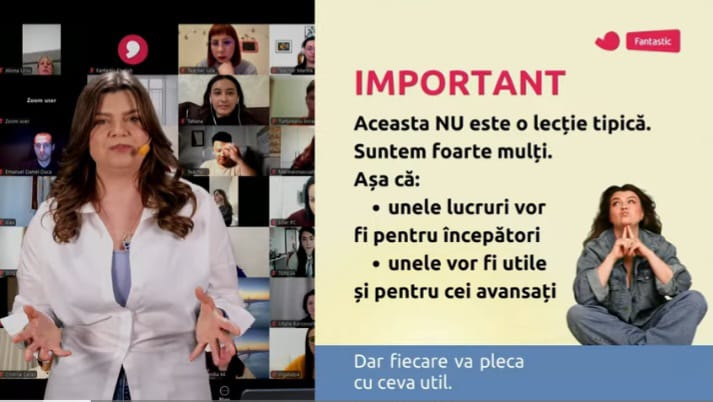 Rita Engleza a reușit să creeze o lecție prietenoasă și interactivă, transformând procesul de învățare într-o experiență accesibilă și plăcută. Pe parcursul lecției, au fost abordate teme esențiale pentru comunicare, de la expresii uzuale până la sfaturi practice pentru îmbunătățirea vocabularului și a pronunției.