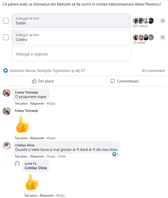 În grupul de pe Facebook, Originar Bădiceni, peste 200 de oameni au susținut inițiativa de atribuire a numelui Alexei Revenco gimnaziului din sat.
