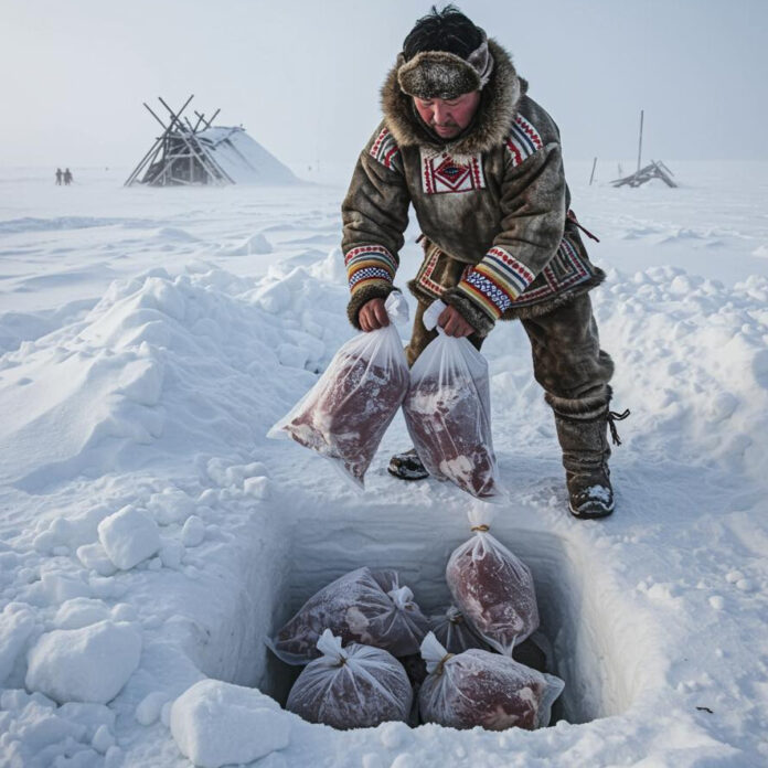În lunile scurte de vară, când soarele încălzește timid tundra, vânătorii și pescarii locali își strâng rezervele pentru iarna lungă care urmează. Carnea de ren, peștele proaspăt și alte produse sunt porționate, uneori uscate ușor în aer liber, apoi coborâte în gropi săpate în permafrost. Acolo, în întunericul rece al pământului înghețat, hrana se păstrează fără a-și pierde gustul, fără conservanți chimici, fără acces la electricitate. Procesul este simplu, dar extrem de eficient.