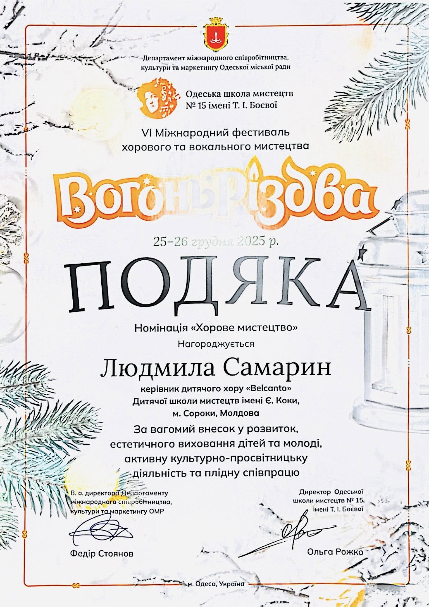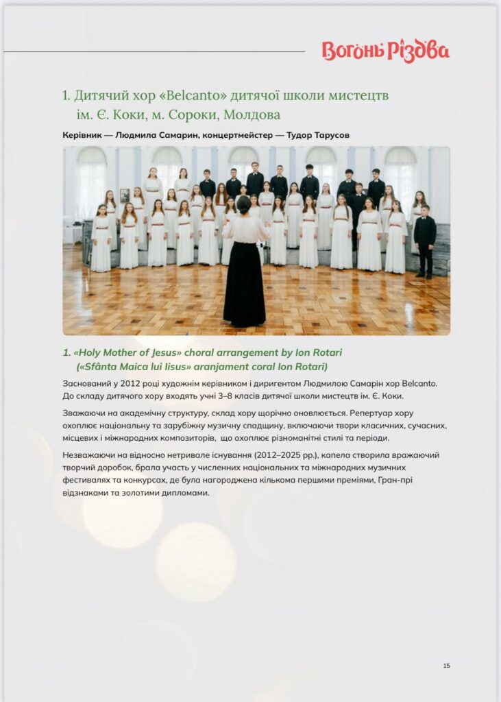 Corul „Belcanto” a participat cu bucurie și succes la cel de-al  VI-lea Festival Internațional de Artă Corală și Vocală „Focul Crăciunului”, desfășurat în perioada 25–26 decembrie 2025 la Odesa, Ucraina.
