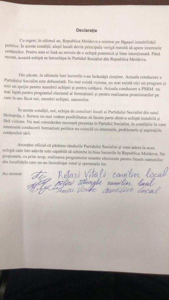 În declarațiile publicate, toți cinci membri au scris că părăsesc Partidul Socialist din Republica Moldova, dar de fapt nu există un așa partid, cei care au ticluit textul au confundat probabil Partidul Socialist din Moldova condus de Victor Morev cu Partidului Socialiștilor din Republica Moldova condus în tandem de Zinaida Grecianîi și Igor Dodon.