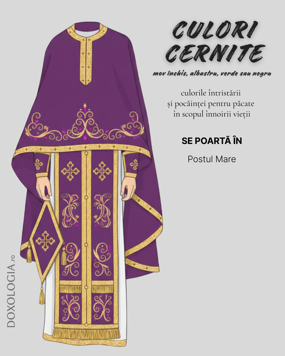 Movul închis, albastrul închis, verdele închis sau negrul sunt considerate culori ale întristării și ale pocăinței pentru păcate. Acestea sunt purtate în special în perioada Postului Mare, când accentul cade pe curățirea sufletească, rugăciune și pregătirea pentru Înviere.