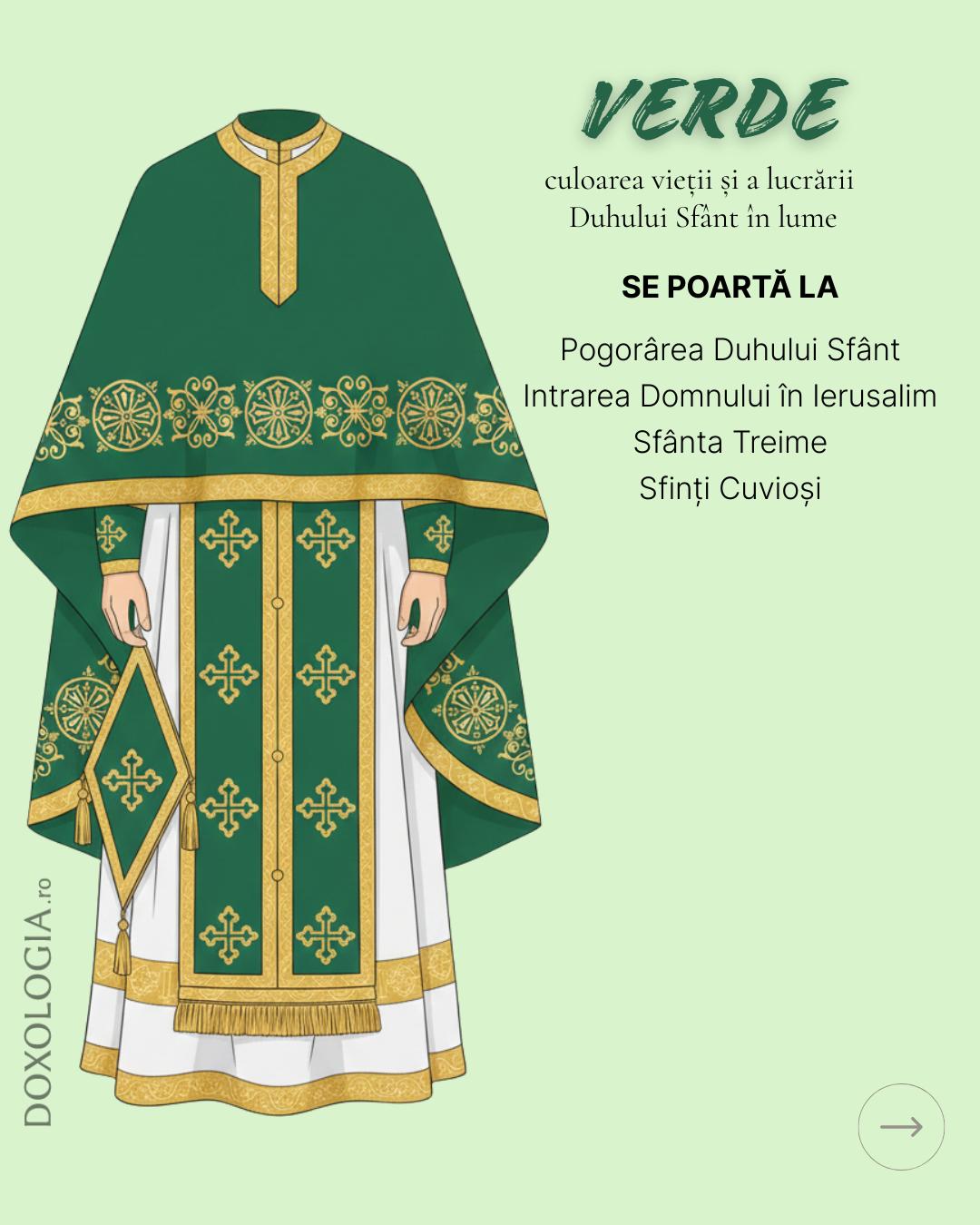 Verdele simbolizează viața și lucrarea Duhului Sfânt în lume. Este purtat la sărbători importante precum Pogorârea Duhului Sfânt, Intrarea Domnului în Ierusalim, Sfânta Treime și la pomenirea sfinților cuvioși. Această culoare subliniază ideea de reînnoire spirituală și creștere duhovnicească.