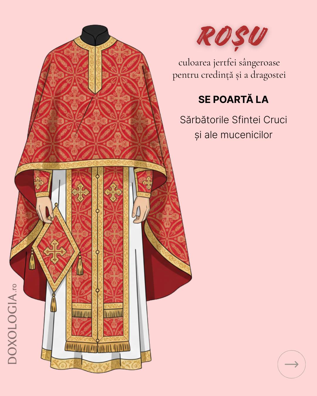 Roșul este culoarea jertfei sângeroase pentru credință și a dragostei desăvârșite. Este purtat la sărbătorile Sfintei Cruci și la pomenirea mucenicilor, amintind de sacrificiul celor care și-au dat viața pentru Hristos.