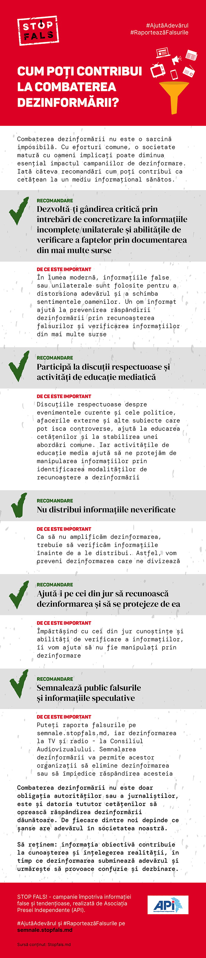 STOP FALS! – campania împotriva informației false și tendențioase, realizată de Asociația Presei Independente (API), prezintă în infograficul de mai jos câteva recomandări utile în acest sens. #NuDezinformării #RaporteazăFalsurile