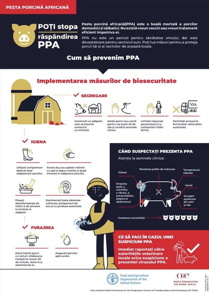 Pesta porcină africană este o boală severă, însă poate fi oprită cu eforturi comune, prin respectarea unor reguli simple de igienă și biosecuritate. Nu este vorba despre restricții, ci despre responsabilitate și măsuri de protecție pentru siguranța familiei Dvs și a comunității în general.