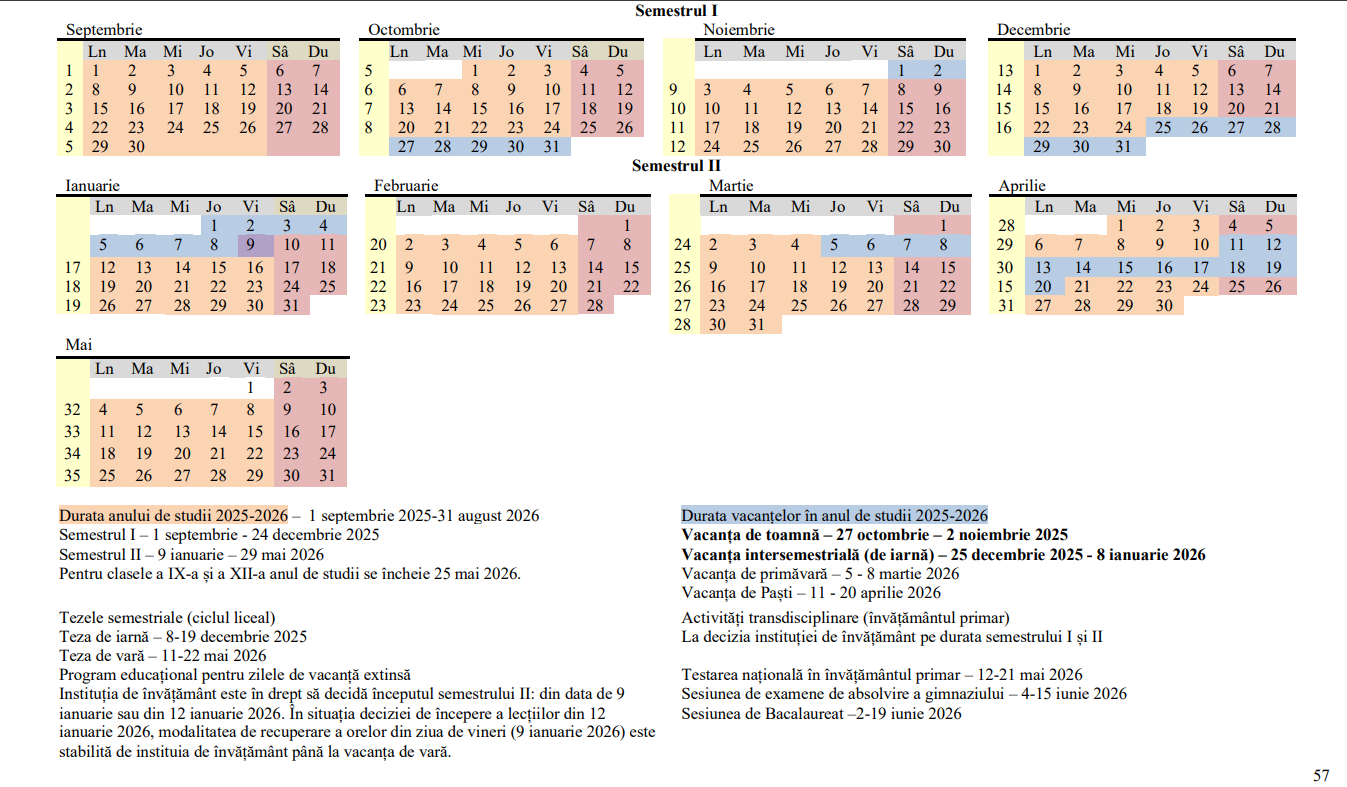 De altfel, instituțiile de învățământ pot să decidă data exactă pentru începutul semestrului II: din data de 9 ianuarie sau din 12 ianuarie 2026. În situația deciziei de începere a lecțiilor din 12 ianuarie 2026, modalitatea de recuperare a orelor din ziua de vineri, 9 ianuarie 2026, va fi stabilită de instituia de învățământ până la vacanța de vară.