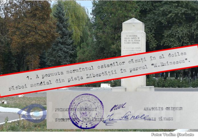 Și într-adevăr, la Serviciul de Arhivă Soroca se găsește decizia primăriei de a muta monumentul și osemintelor ostașilor din Piața „Libertății” în Parcul „Mihai Eminescu”. Documentul este datat cu 28 aprilie 1994.