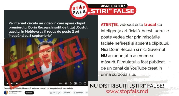 Pe internet circulă un video în care apare chipul premierului Dorin Recean, însoțit de titlul „Costul gazului în Moldova va fi redus de peste 2 ori începând cu 8 septembrie”.