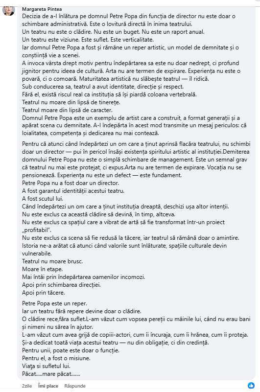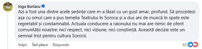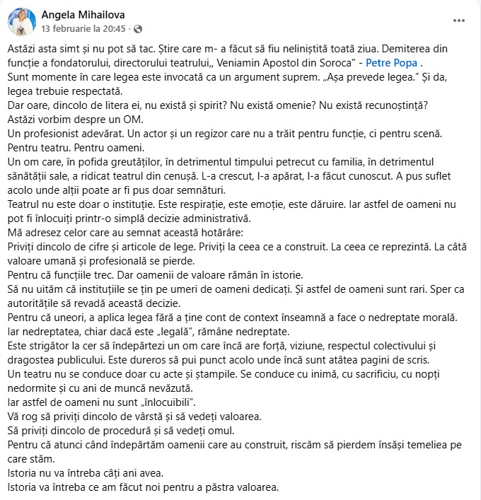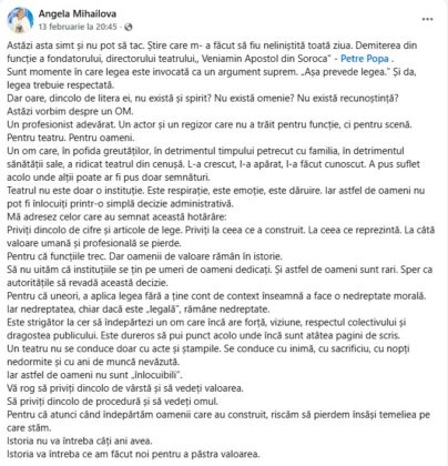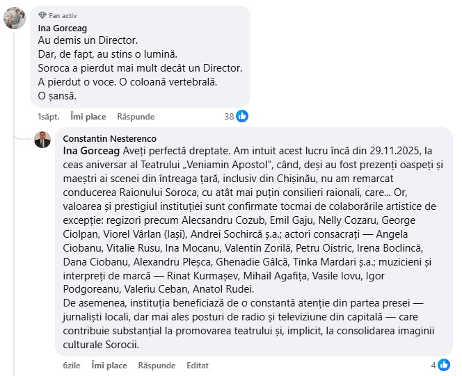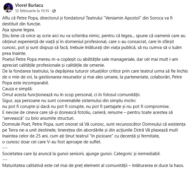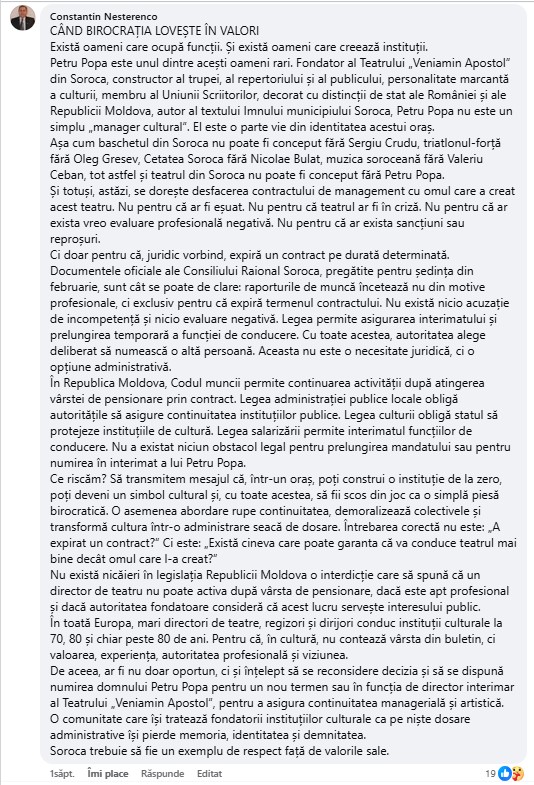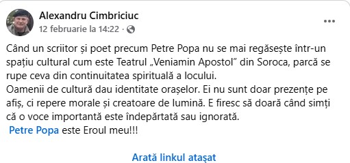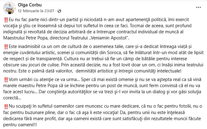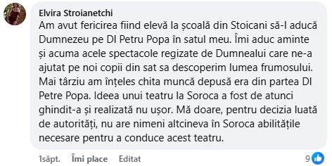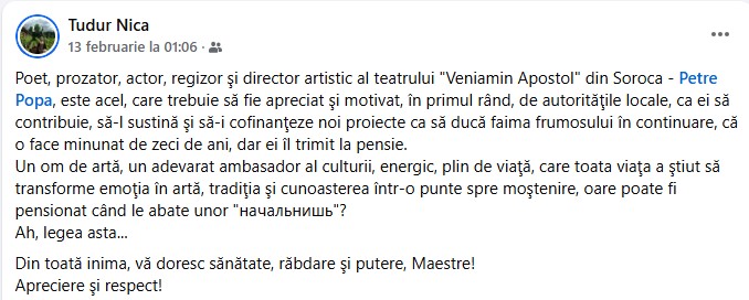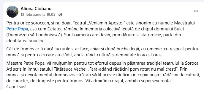 Amintim că la ședința din 12 februarie a Consiliului raional Soroca, cu majoritatea voturilor și cu nouă abțineri, s-a decis încetarea raportului de muncă cu directorul Instituției Publice „Teatrul Veniamin Apostol”, maestrul Petre Popa, unul din stâlpii incontestabili ai culturii sorocene.