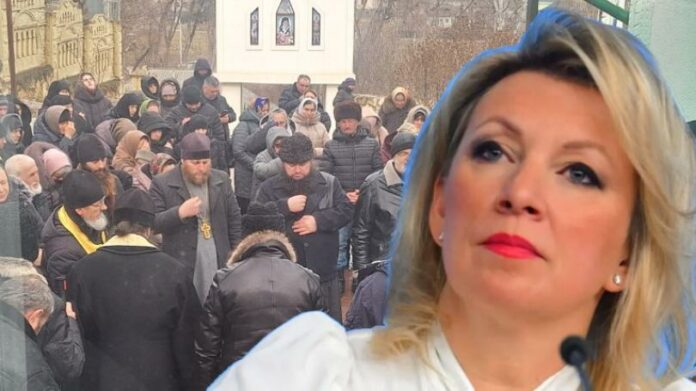 „Vedeți cât de interesant este. În prezent, mai multe țări se adresează instanțelor de judecată nu pentru a soluționa dispute ideologice sau litigii legate de proprietăți, denumiri ori drepturi de autor. Nu. Ci pentru a „transfera” credincioșii dintr-o confesiune în altaAre loc un atac asupra ortodoxiei din Moldova – acea ortodoxie pe care moldovenii o respectă și o practică cu adevărat. Iată, de câteva săptămâni, enoriașii unei biserici canonice din satul Dereneu, raionul Călărași, aflată în subordinea Bisericii Ortodoxe din Moldova, încearcă să împiedice trecerea acesteia în subordinea Mitropoliei Basarabiei a Bisericii Ortodoxe Române.”, a declarat Zaharova.