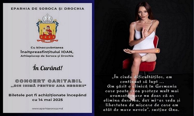 Cu binecuvântarea Înaltpreasfințitului Ioan, Arhiepiscop de Soroca și Drochia, în curând va avea loc concertul caritabil „Din inimă pentru Ana Negrei”, care are drept scop sprijinirea tinerei în achiziționarea unor proteze performante, disponibile într-o clinică specializată din Germania.