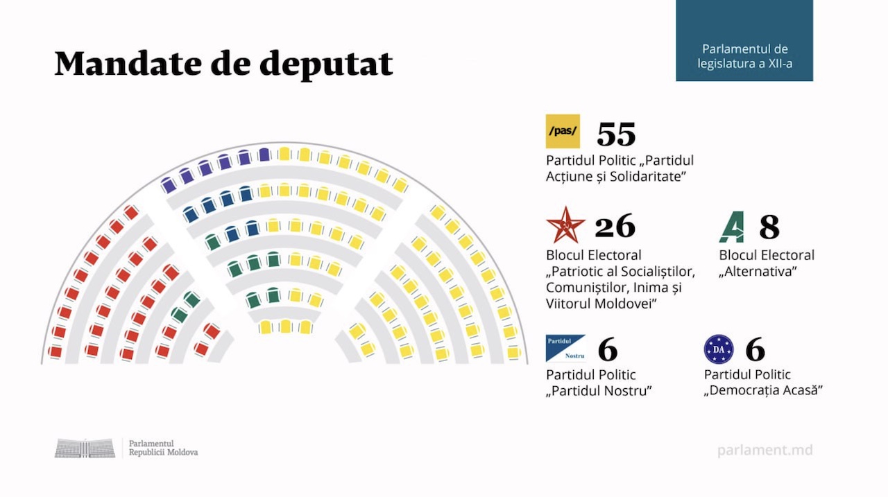 Noul Parlament al R. Moldova, constituit în urma alegerilor din 28 septembrie 2025, este format din 55 de deputați aleși pe listele Partidului Acțiune și Solidaritate (PAS), 26 de deputați ai Blocului „Patriotic”, opt deputați ai Blocului „Alternativa” și câte șase deputați din partea formațiunilor politice Partidul Nostru și Partidul „Democrația Acasă” (PPDA).