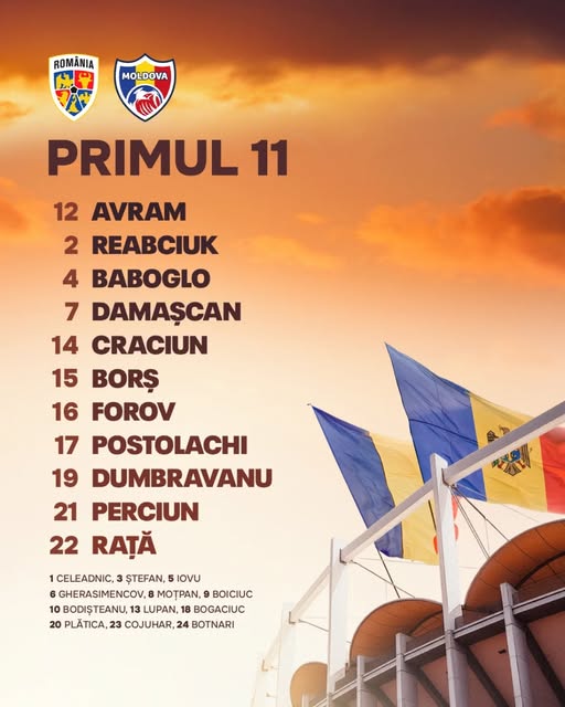 România: 1.Ionuț RADU, 3.Mihai POPESCU, 4.Cristian MANEA, 10.Ianis HAGI (22.Cătălin CÎRJAN, 70), 15.Raul OPRUȚ (2.Kevin CIUBOTARU, 46), 14.Vladimir SCRECIU, 17.Louis MUNTEANU (11.David MICULESCU, 58), 21.Olimpiu MORUȚAN (20.Dennis MAN, 58), 23.Vlad DRAGOMIR (19.Florin TĂNASE, 89), 24.Lisav Naif EISSAT, 26.Ștefan BAIARAM (7.Alexandru DOBRE, 58)