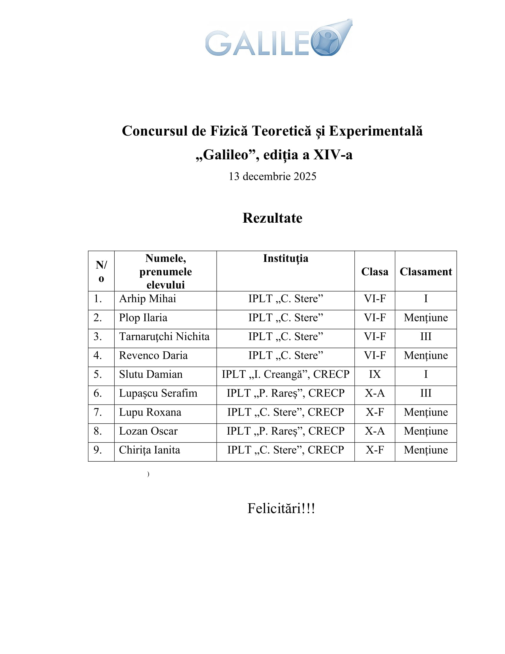 Instituția Publică Liceul Teoretic „Gaudeamus” și Liceul Teoretic „Orizont” din capitală au organizat a XIV-a ediție a Concursului Republican de Fizică Teoretică și Experimentală „Galileo”, la care au participat și un grup de tineri fizicieni soroceni.