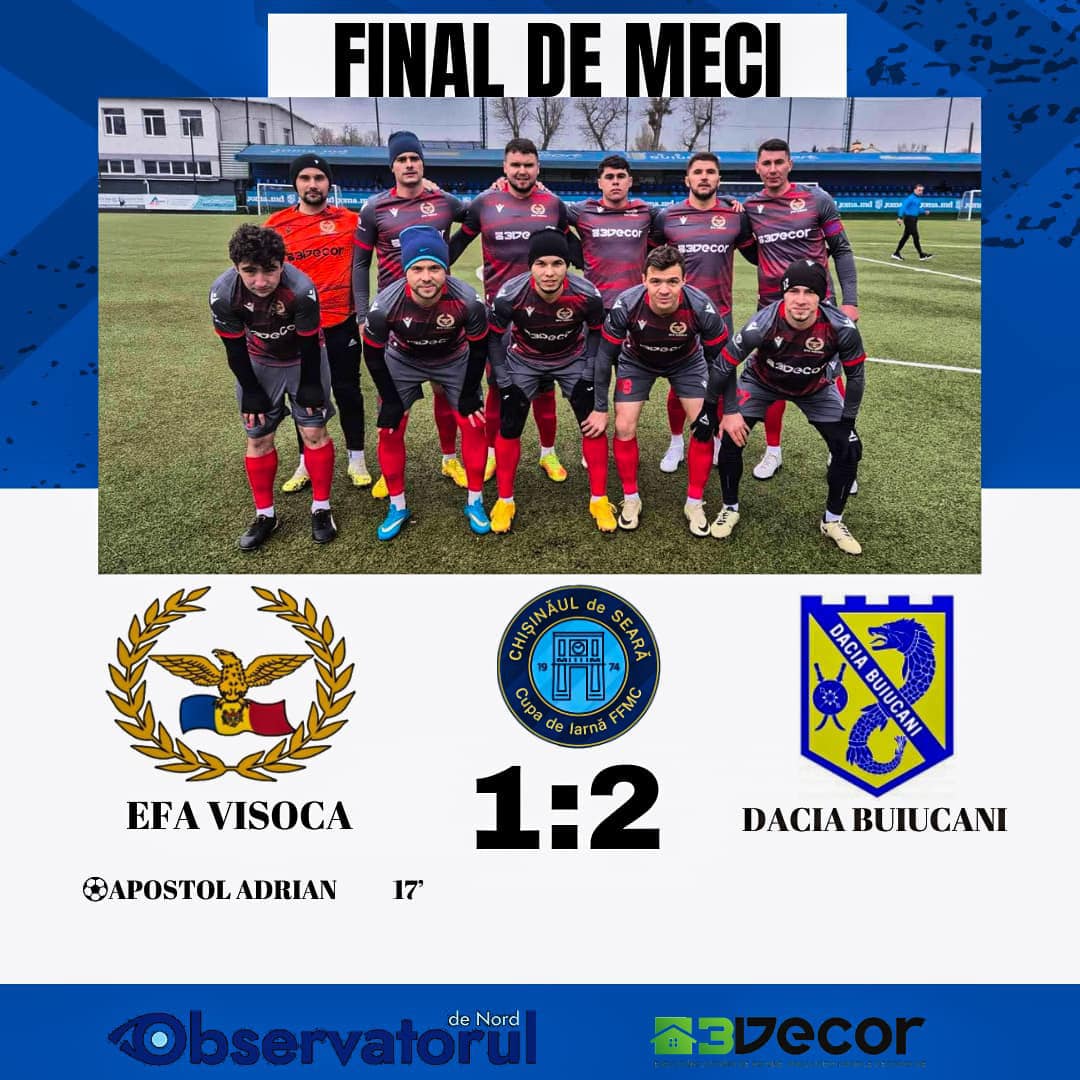 Parcurs foarte bun pentru fotbaliștii de la EFA Visoca la Cupa de iarnă „Chișinăul de Seară”, unde fotbaliștii noștri au pierdut meciul din 1/4 de finală în confruntarea cu câștigătoarea turneului, Dacia Buiucani. Golul vosocenilor a fost marcat de Adrian Apostol.