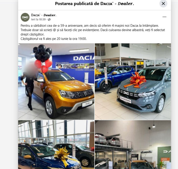 „Pentru a sărbători cea de-a 59-a aniversare, am decis să oferim 4 mașini noi Dᴀᴄɪᴀ la întâmplare. Trebuie doar să scrieți @ și să faceți clic pe evidențiere. Dacă culoarea devine albastră, veți fi selectat drept câștigător. Câștigătorul va fi ales pe 20 iunie la ora 19:00.”