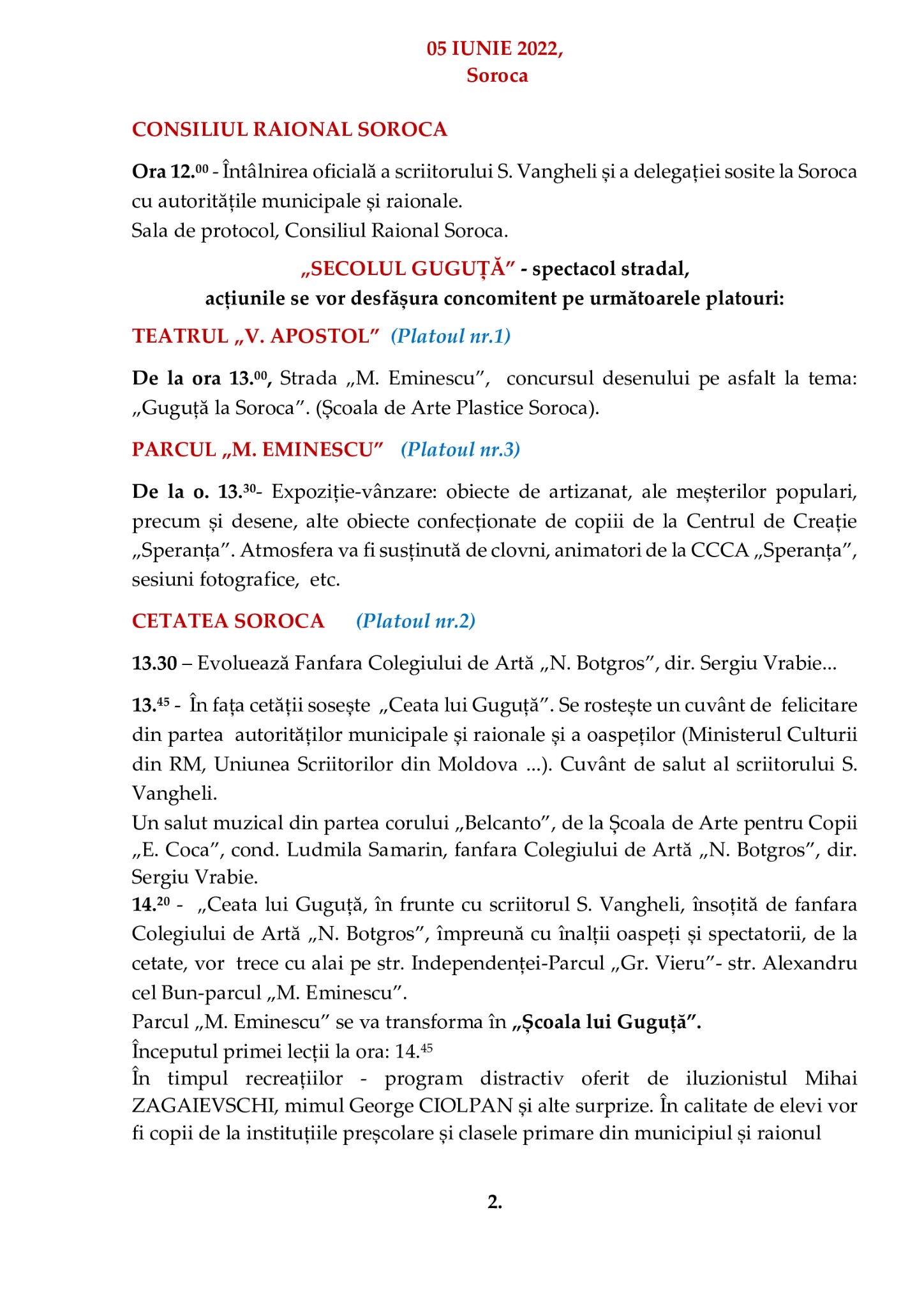 Spectacolul se va începe la ora 14:00, de la Cetatea Soroca, continuând cu „Alaiul lui Guguță” pe străzile municipiului, până în parcul „Mihai Eminescu”, unde își va deschide larg ușile „ȘCOALA LUI GUGUȚĂ”. Spiridon VANGHELI este scriitorul care a marcat literatura română a secolului trecut și va trece peste secole ca lumina Soarelui de la o zi la alta. Soroca a avut câteva ocazii de a găzdui scriitorul. De această dată prilejul este unul deosebit și vom oferi un spectacol pe cinste. O condiție rămâne, însă, neschimbată: opera lui Spiridon Vangheli trebuie mai întâi citită și onorată acum, aici (!). Țările lumii au reușit să facă mult, astfel autorul a ajuns să fie „cel mai tradus scriitor pentru copii din tot spațiul românesc”.PREZENȚA DOMNIEI SALE ÎN SPECTACOLUL DE LA SOROCA, ÎN DATA DE 05 IUNIE, ESTE UN PRILEJ DEOSEBIT SĂ-L ONORĂM CU PREZENȚA: COPII, PĂRINȚI, BUNICI SAU, PUR ȘI SIMPLU, OAMENI IUBITORI DE FRUMOS!