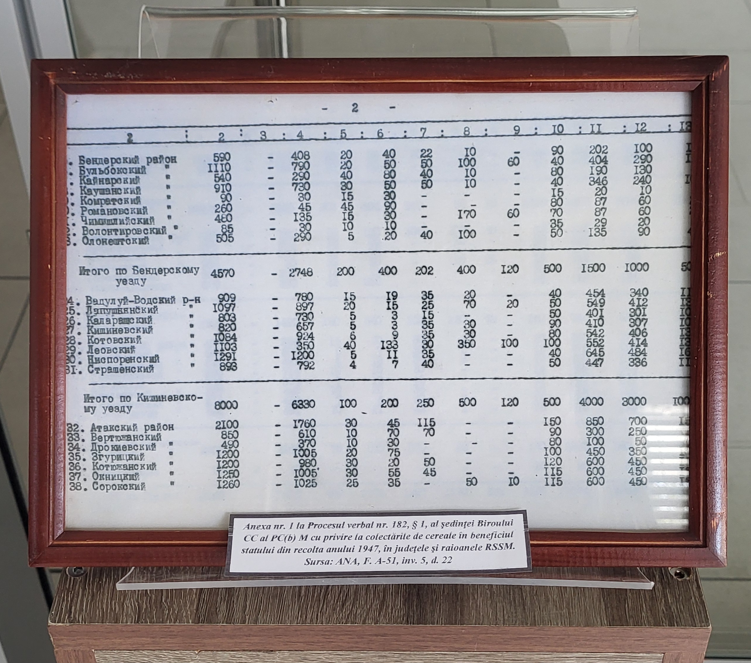 Expoziția explică pe scurt ce s-a întâmplat în anii 1946-1947. Foametea a lovit puternic populația din RSS Moldovenească. Istoricii arată că a fost una dintre cele mai grave crize din regiune. Cel puțin 400 de mii de oameni au suferit de foame. Dintre aceștia, peste 123 de mii au murit. Au fost înregistrate și cazuri de canibalism.