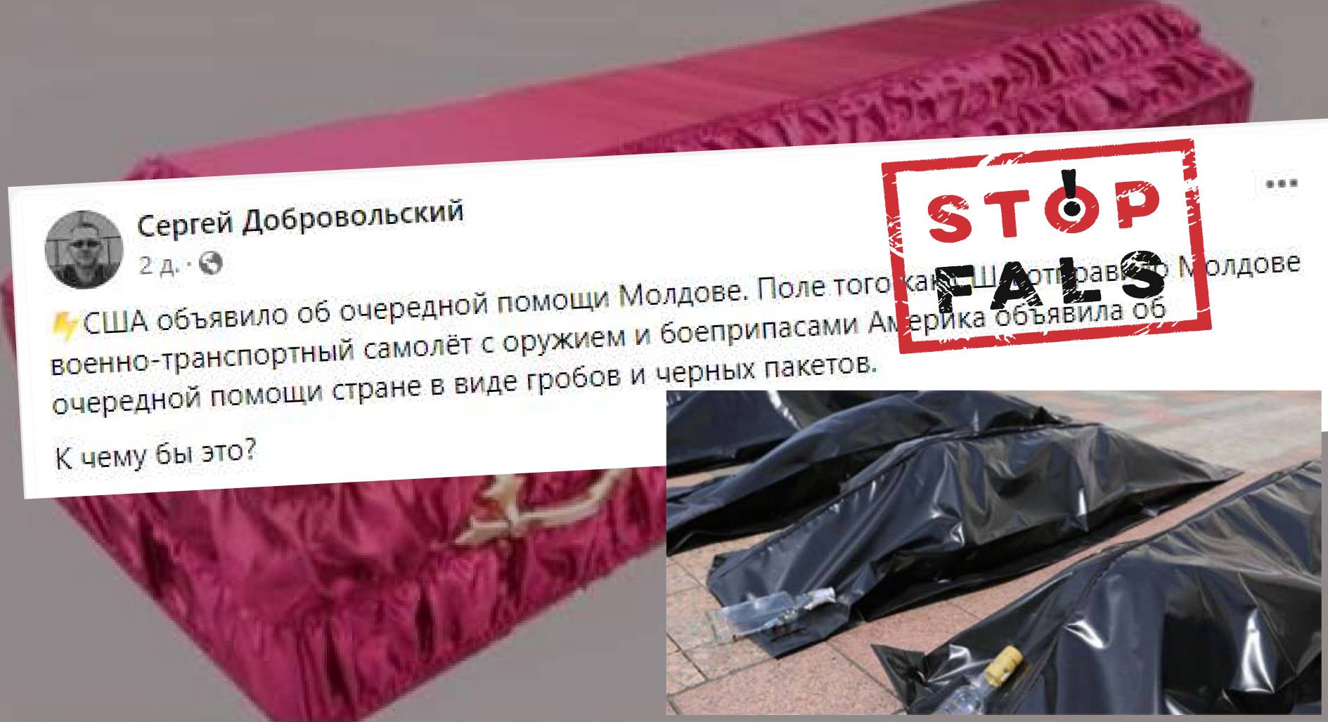 Pe Facebook este publicată și promovată o postare în care se afirmă că „America a anunțat o nouă asistență pentru Moldova care constă din sicrie și saci negri”. Persoana care a publicat această informație afirmă că a preluat-o de pe canalul de Telegram „Приднестровец”. Afirmația respectivă nu este confirmată în niciun fel. Surse din cadrul Guvernului şi Ministerului Apărării din Moldova au declarat că este un fals.