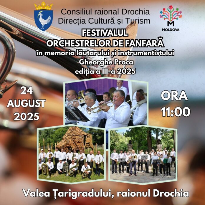 Pe 24 august, începând cu ora 11:00, sunteți așteptați cu drag la un eveniment muzical, organizat în inima naturii, la intrarea în satul Țarigrad – Valea Țarigradului , raionul Drochia. Este vorba despre Festivalul Orchestrelor de Fanfară, dedicat memoriei lui Gheorghe Proca, un cunoscut instrumentist și lăutar din zonă, care și-a lăsat amprenta în lumea muzicii populare și în inimile oamenilor.