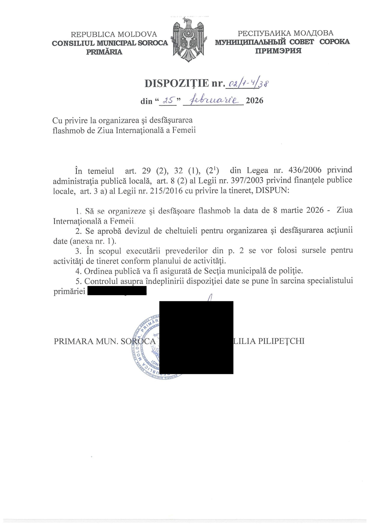 Primăria municipiului Soroca a emis o dispoziție oficială privind organizarea unui flashmob dedicat Zilei Internaționale a Femeii, care va avea loc pe 8 martie 2026. Evenimentul va include oferirea a 700 de lalele, achiziționate din bugetul destinat activităților de tineret, cu o valoare totală de 21.000 de lei.